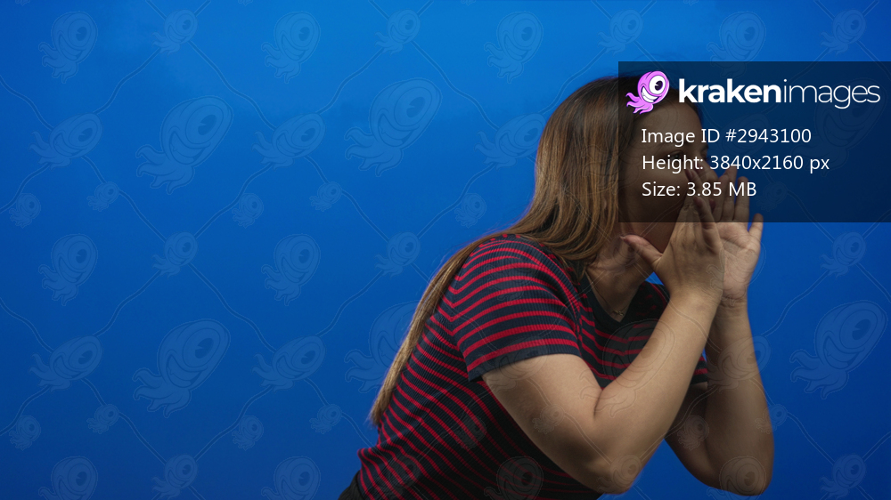 Young caucasian woman cupping hands around mouth in studio against a bright blue backdrop, wearing a striped top and calling outward; urgent message surprise. - Kraken Images