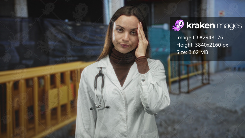 Young caucasian woman doctor with stethoscope pressing hand to temple for headache at a construction building site; fatigue resilience.