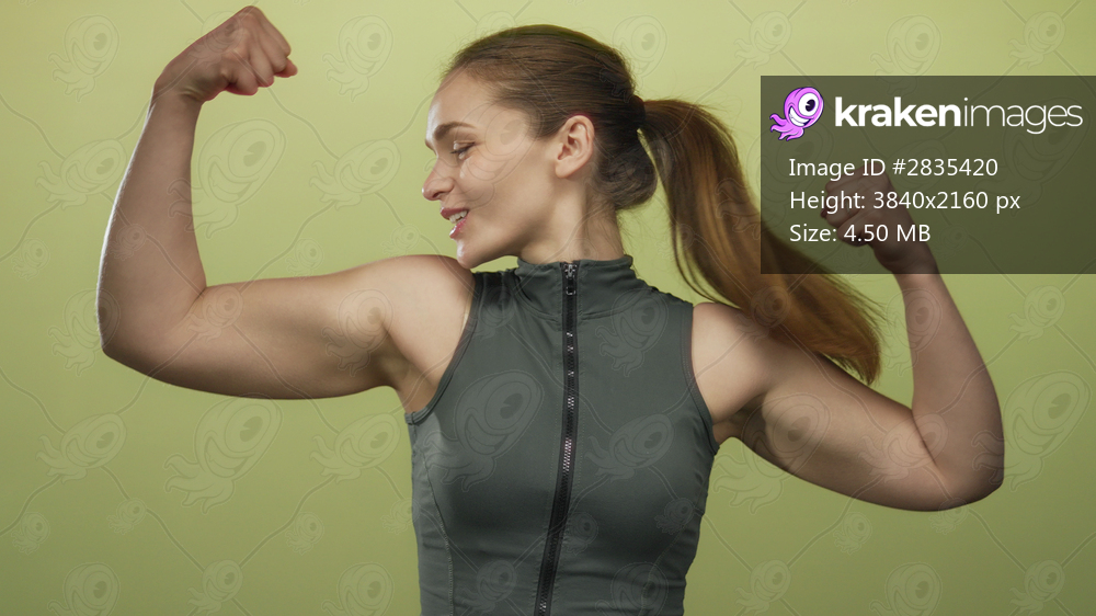 Young caucasian woman flexes toned biceps in studio in a sleeveless athletic top highlighting muscle definition and physical power; confidence empowerment. - Kraken Images