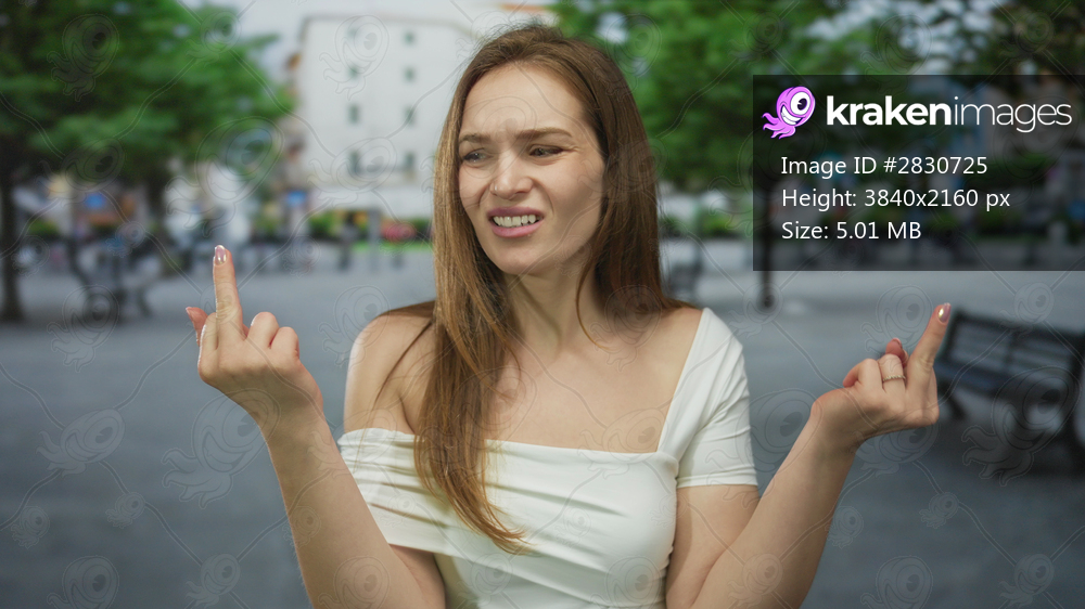 Young caucasian woman flips middle finger with both hands on busy city street, scowling at passersby; defiance.