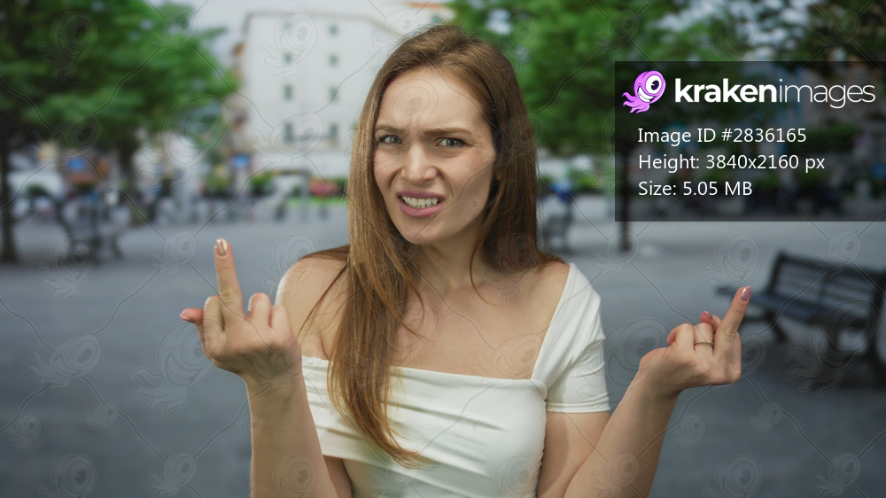 Young caucasian woman flips middle finger with both hands on busy city street, scowling at passersby; defiance.