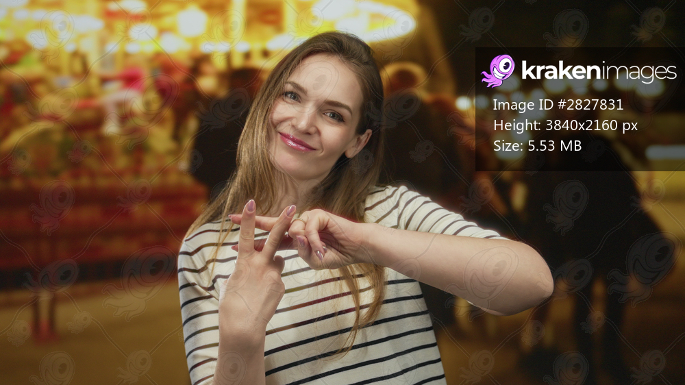 Young caucasian woman forming hashtag gesture with interlocked fingers on illuminated street at night; social connection.
