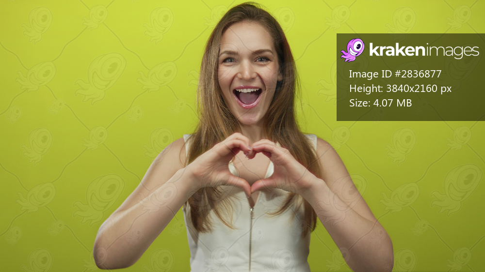 Young caucasian woman forming heart shape with hands and smiling in bright green studio; love happiness.