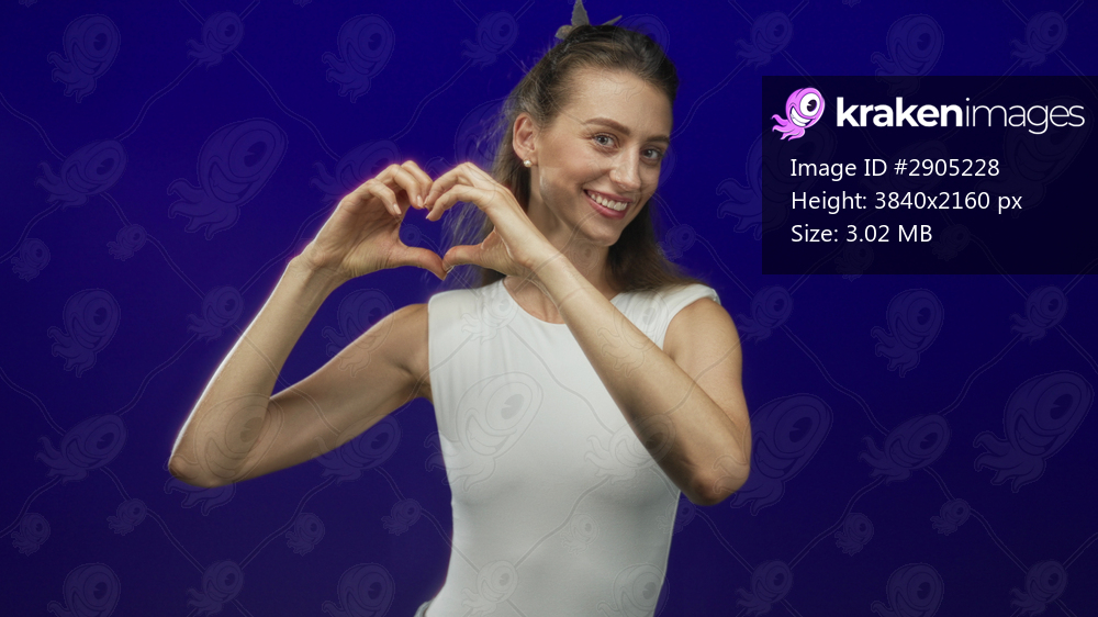 Young caucasian woman forms heart with hands and smiles in blue studio wearing white sleeveless top; love kindness.