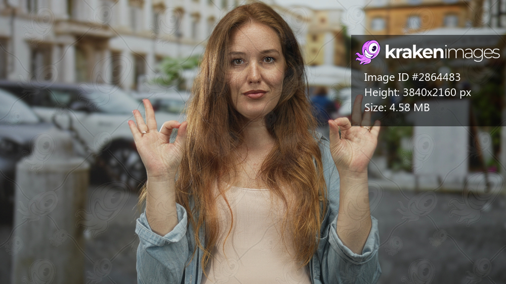 Young caucasian woman forms ok sign with her hands in a busy city street near cafe buildings; calm confidence.