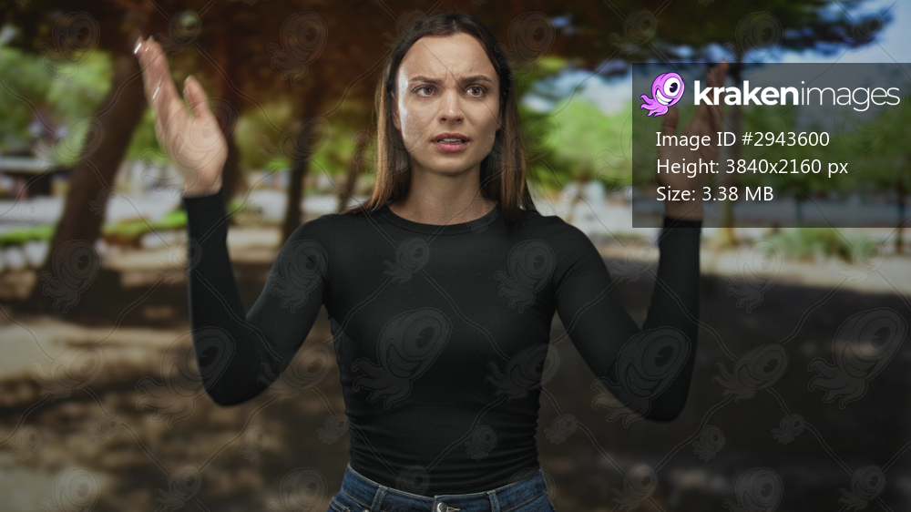 Young caucasian woman frowning with hands raised beside head in forest setting wearing black top and jeans; frustration communication barrier.