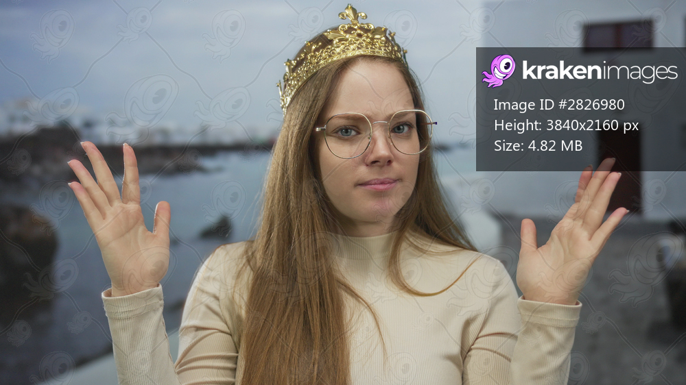 Young caucasian woman with gold crown raises hands in shrug gesture on seaside promenade overlooking waterfront; confusion.