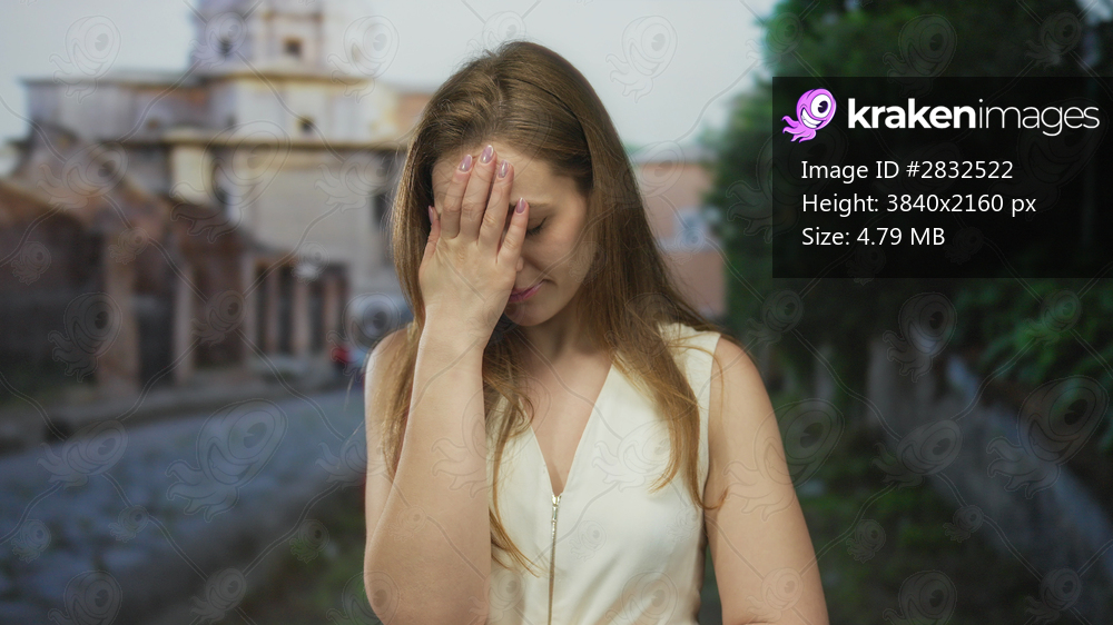 Young caucasian woman grasping forehead in pain for headache on old town cobblestone street; stress.