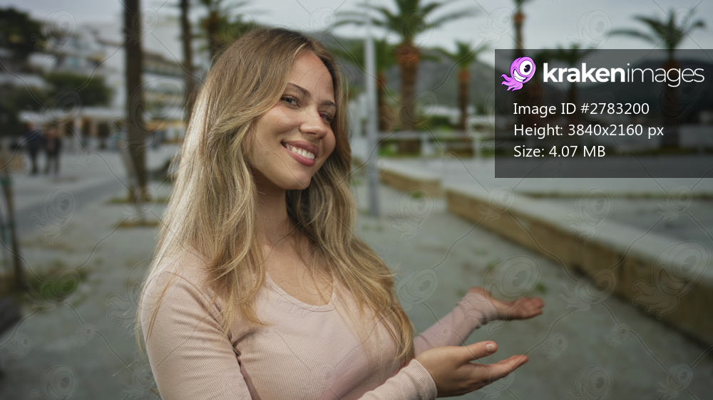 Young caucasian woman hair framing face smiling and showing open palms on seaside promenade; invitation friendliness joy serenity.