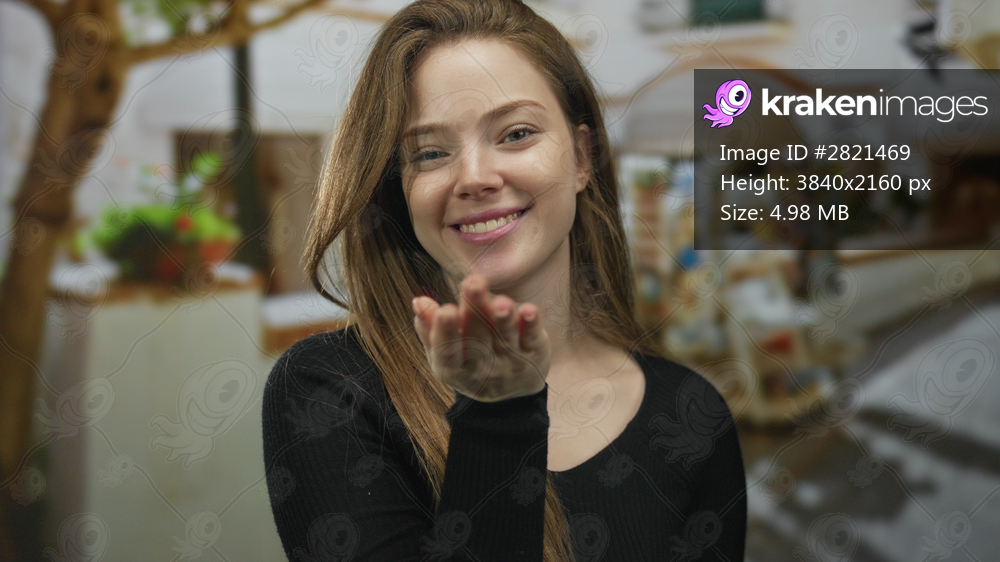 Young caucasian woman hand blowing kiss with smiling face on city street by potted plants and blurred storefront windows; affection.