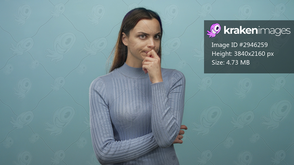 Young caucasian woman with hand on chin and arms crossed thinking in studio against teal backdrop; thoughtful reflection.