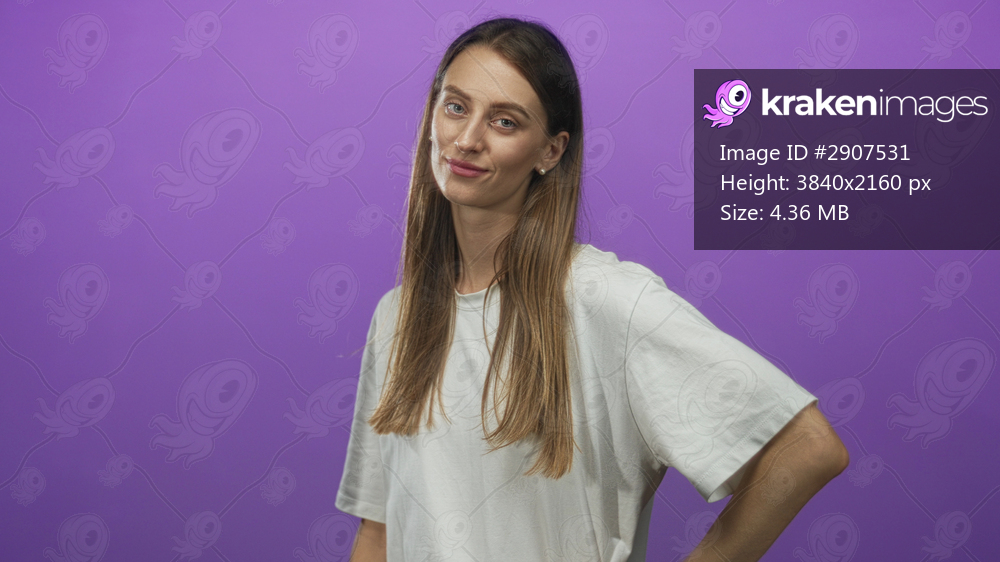 Young caucasian woman with hand on hip and visible face in a purple studio backdrop wearing white tshirt; casual confidence.