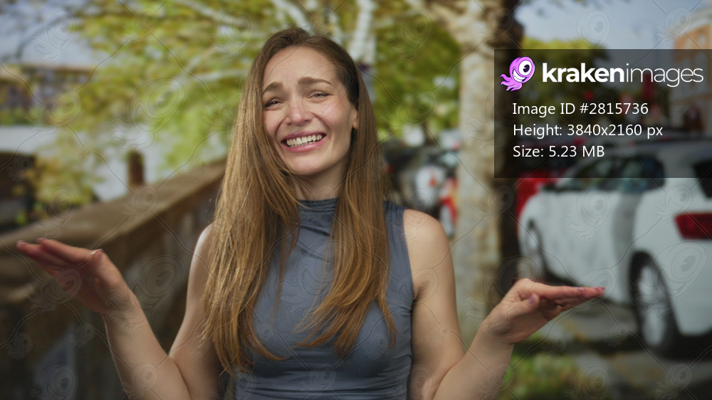 Young caucasian woman with hand to mouth gesture on autumn urban street in city outdoors showcasing candid expression; amusement.