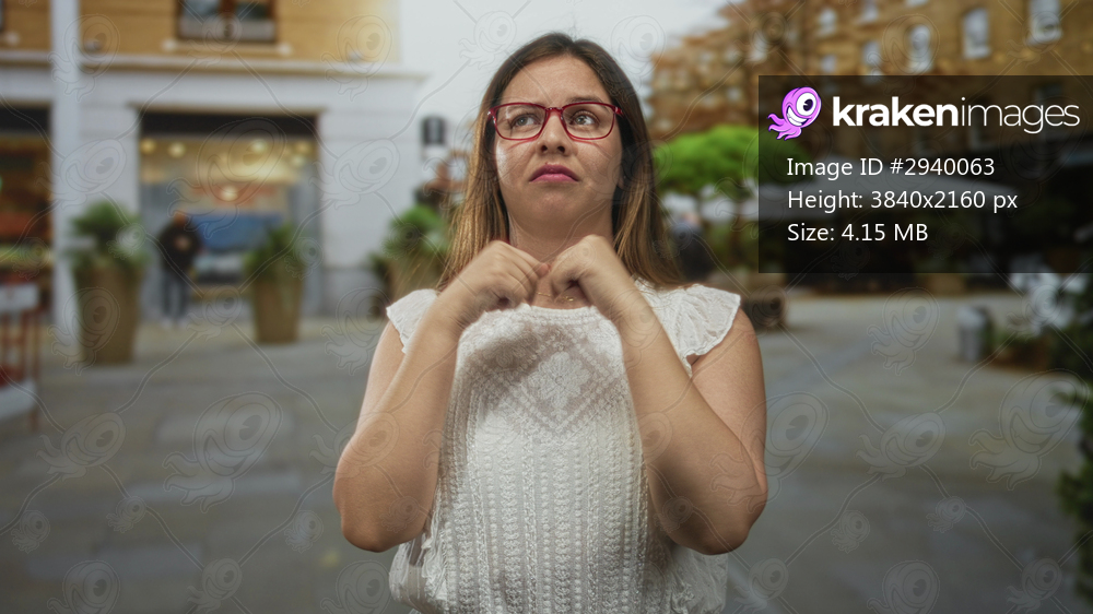 Young caucasian woman with hands clasped to chest on city street wearing red glasses and white top; frustration.