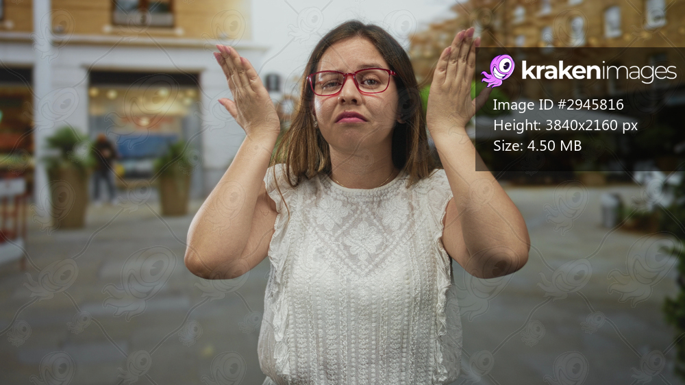 Young caucasian woman with hands clasped to chest on city street wearing red glasses and white top; frustration.