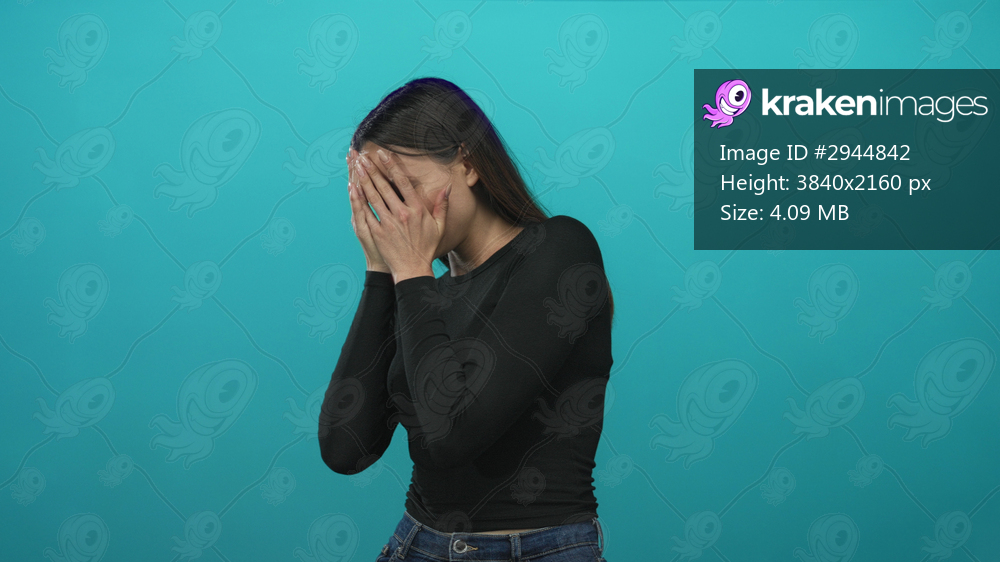 Young caucasian woman hands covering mouth in studio teal backdrop, furrowed brow and hunched posture; anxiety vulnerability.