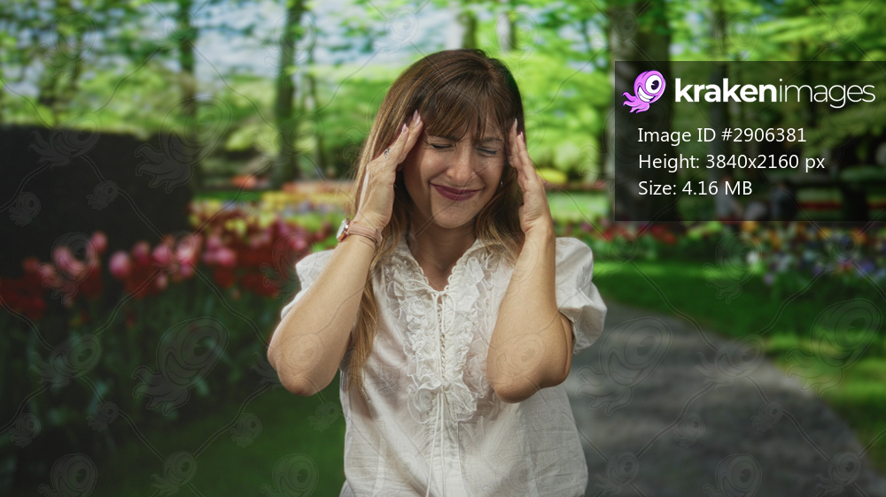 Young caucasian woman with hands on temples on a forest path among tulips and trees clutching head for headache; discomfort.