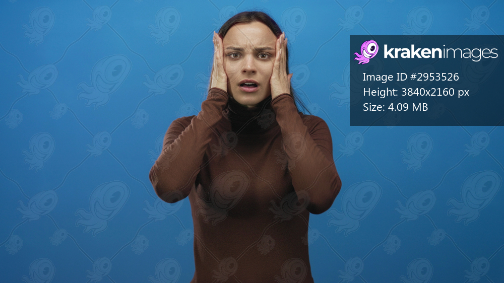 Young caucasian woman with hands raised beside head in studio against blue backdrop, wearing brown turtleneck, frowning and speaking with open mouth; frustration. - Kraken Images