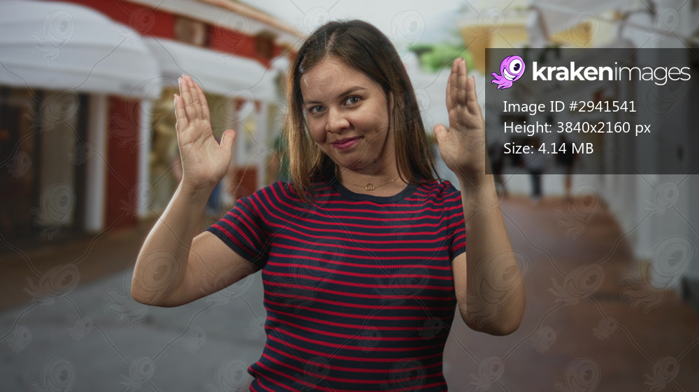 Young caucasian woman hands raised palms out on street smiling at camera with open gesture; playful confidence.