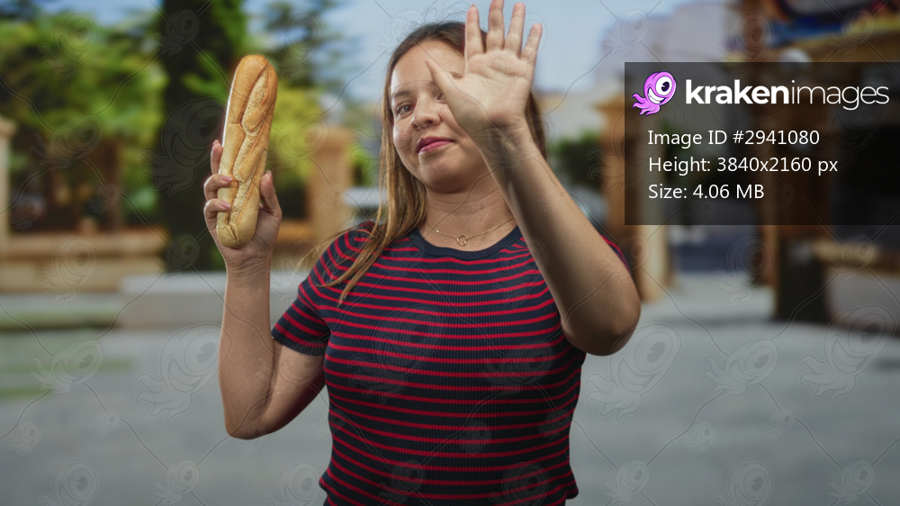 Young caucasian woman holding a baguette and raising her hand palm to camera on a sunny street with columns; playful defiance.