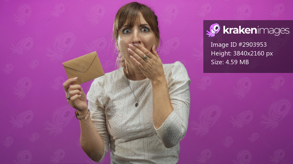 Young caucasian woman holding a brown envelope, hand covering mouth and eyes wide in a pink studio setting; surprise reaction.