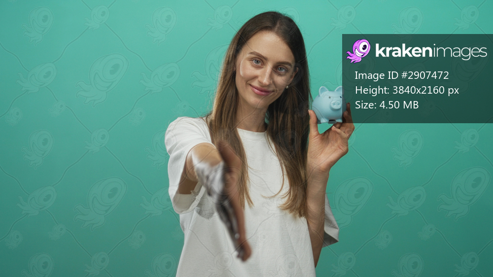 Young caucasian woman holding a small blue piggy bank and extending her hand for a handshake in studio; savings trust.