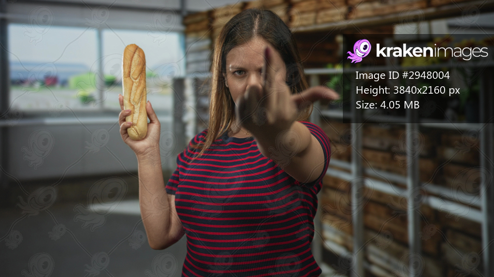 Young caucasian woman holding baguette in raised hand and showing middle finger toward camera inside building bakery with wooden shelves; defiance.