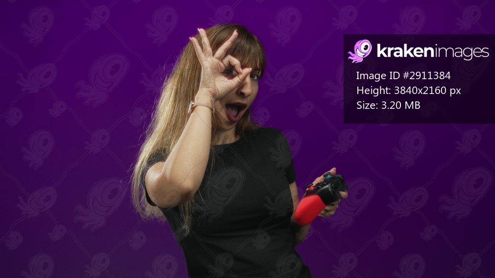 Young caucasian woman holding bright red game controller making ok sign with right hand by eye in purple studio; playful gaming.