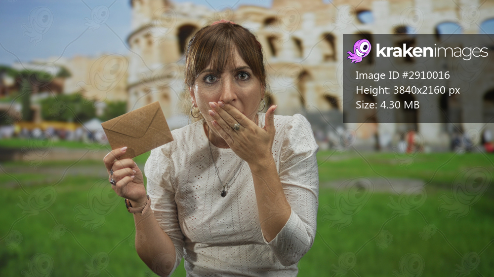 Young caucasian woman holding brown envelope with hand to mouth at coliseum building outdoors, startled expression; surprise curiosity.