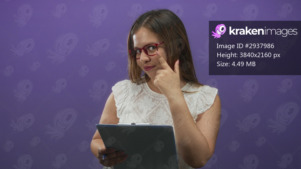 Young caucasian woman holding clipboard and finger pointing to cheek in purple studio; thoughtful evaluation.