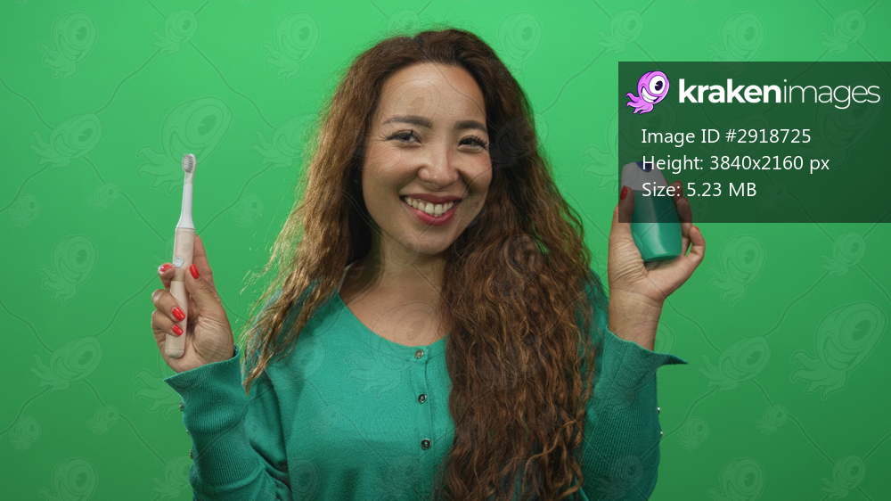 Young caucasian woman holding electric toothbrush and green bottle while smiling at camera in studio; happiness oral health.