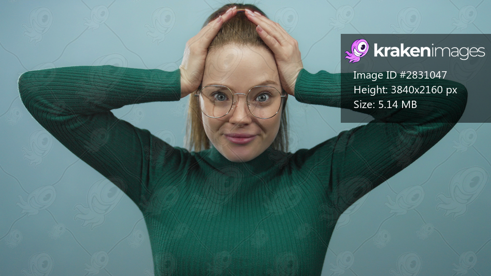Young caucasian woman holding head with hands and glasses in studio while wearing green sweater; frustration.