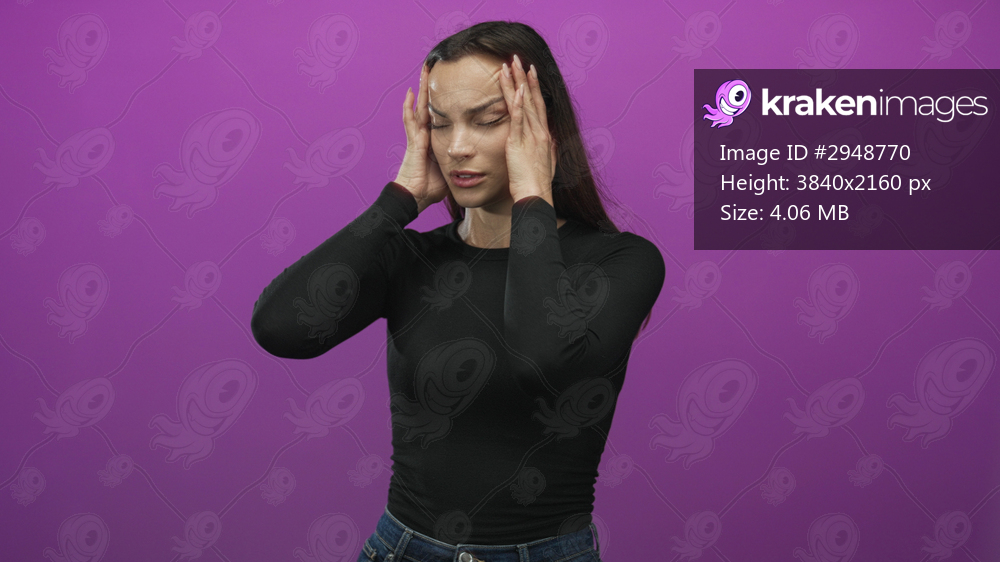 Young caucasian woman holding her temples for headache and frowning with closed eyes in a purple studio; stress discomfort.