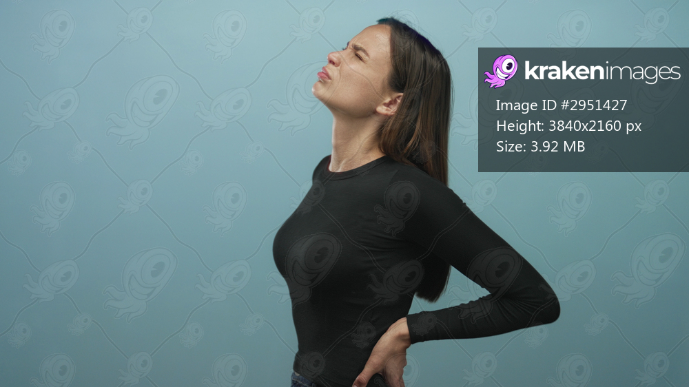 Young caucasian woman holding lower back and grimacing in studio against a pale blue backdrop; pain discomfort.