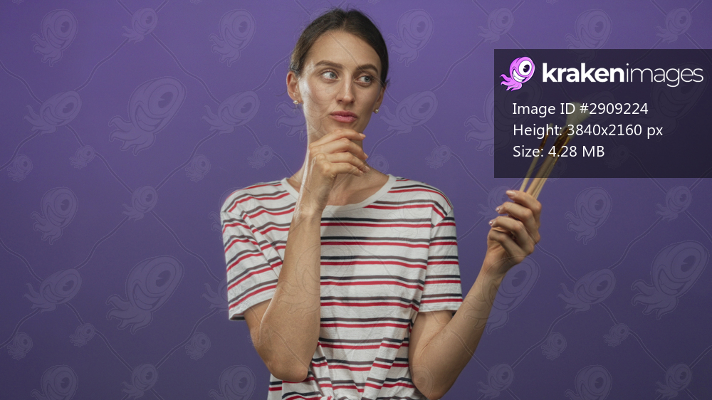 Young caucasian woman holding paintbrushes, hand on chin in purple studio; creative thinking thoughtful art.