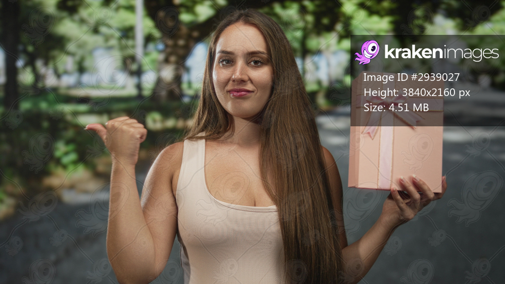 Young caucasian woman holding pink gift box and giving thumbs up while smiling in park; confidence celebration playful.