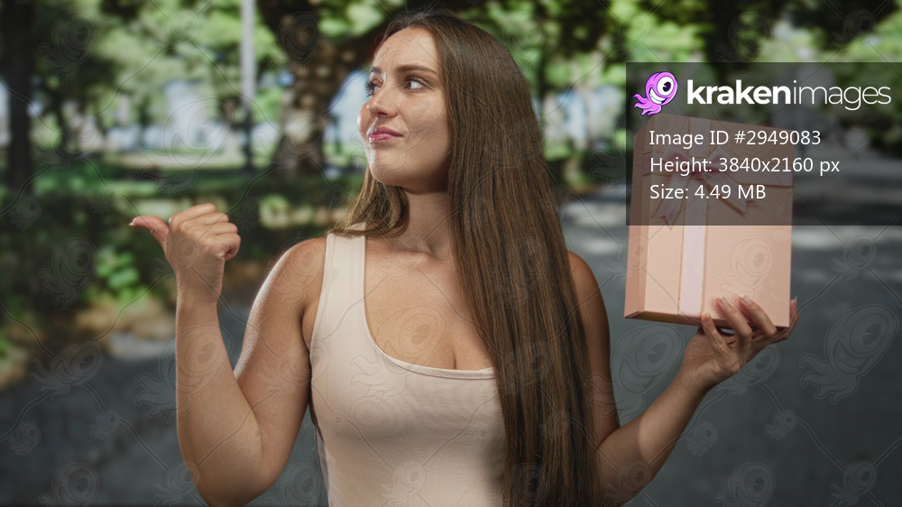 Young caucasian woman holding pink gift box and giving thumbs up while smiling in park; confidence celebration playful.