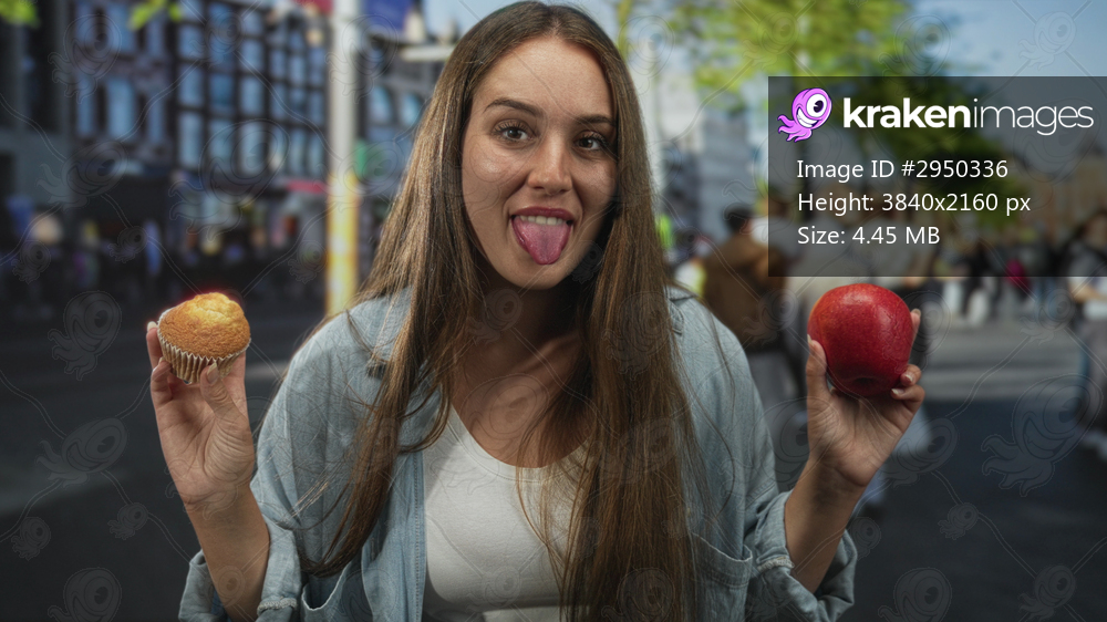 Young caucasian woman holding red apple and muffin with both hands on a busy city street, tongue out and smiling; playful choice.