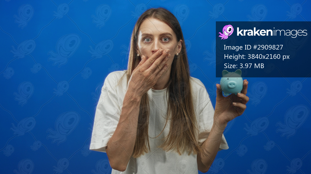 Young caucasian woman holding small blue piggy bank and covering mouth with hand in studio; money worry.