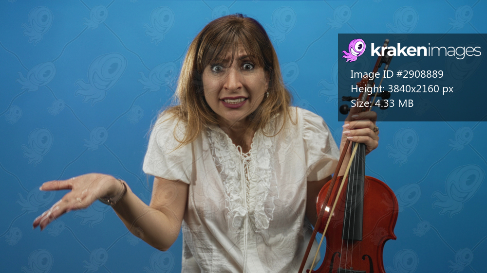 Young caucasian woman holding violin and bow and gesturing with open palm while looking at camera in a blue studio; confusion question.