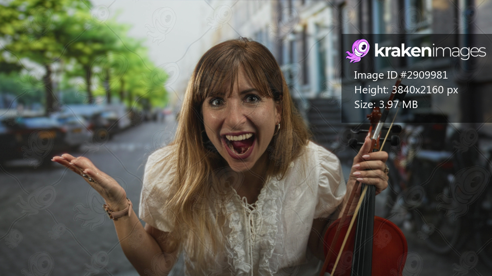 Young caucasian woman holding violin and bow, hands raised in shrug on a narrow city street lined with bicycles and parked cars; surprise.