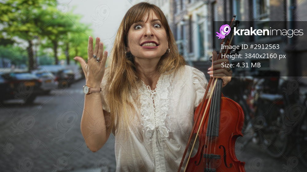 Young caucasian woman holding violin and bow, hands raised in shrug on a narrow city street lined with bicycles and parked cars; surprise.