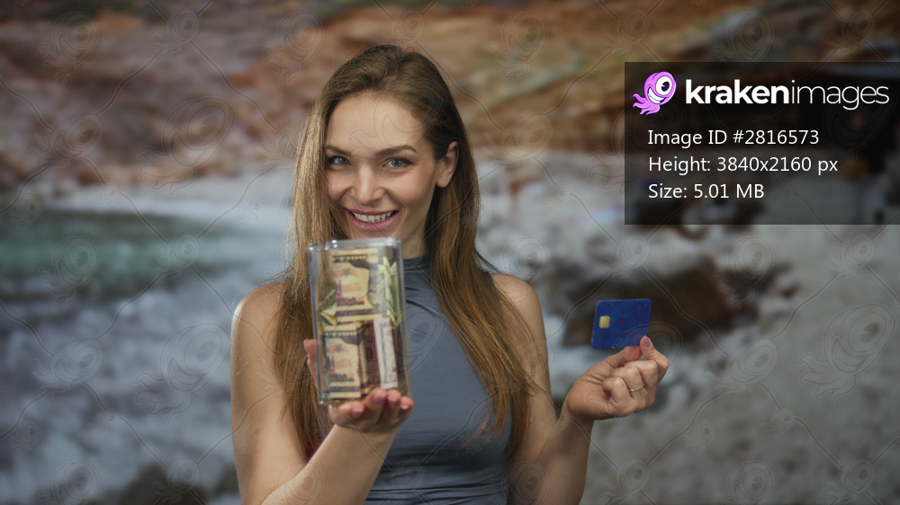 Young caucasian woman holds creditcard between fingers and presents money jar in studio; saving growth optimism.
