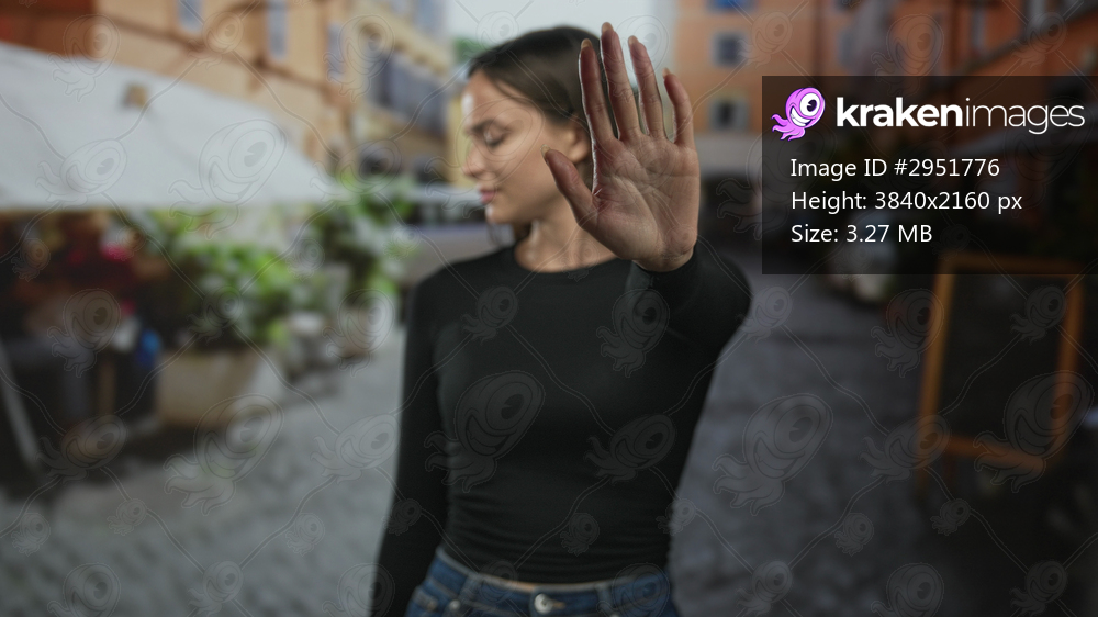 Young caucasian woman holds hand up palm out in front of face on cobblestone street by outdoor cafe, eyes closed and grimacing; defiance boundary.
