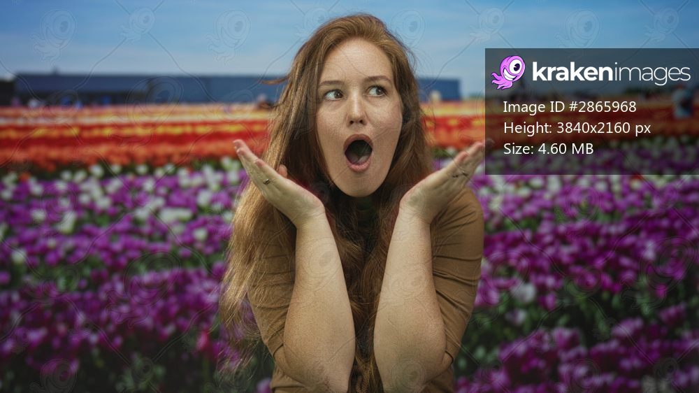 Young caucasian woman holds open palms under chin among tulip flowers in front of a building; surprise.