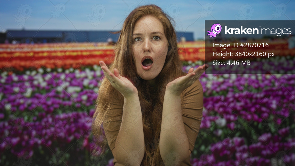Young caucasian woman holds open palms under chin among tulip flowers in front of a building; surprise.