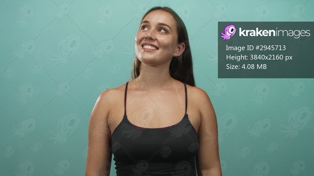 Young caucasian woman in black tank top smiling and looking up with visible face and shoulders against teal studio backdrop; serene.
