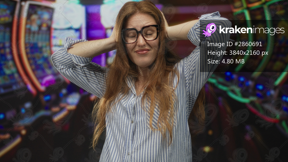 Young caucasian woman in blue striped shirt pushes hands behind head at colorful slot machines in casino; frustration.