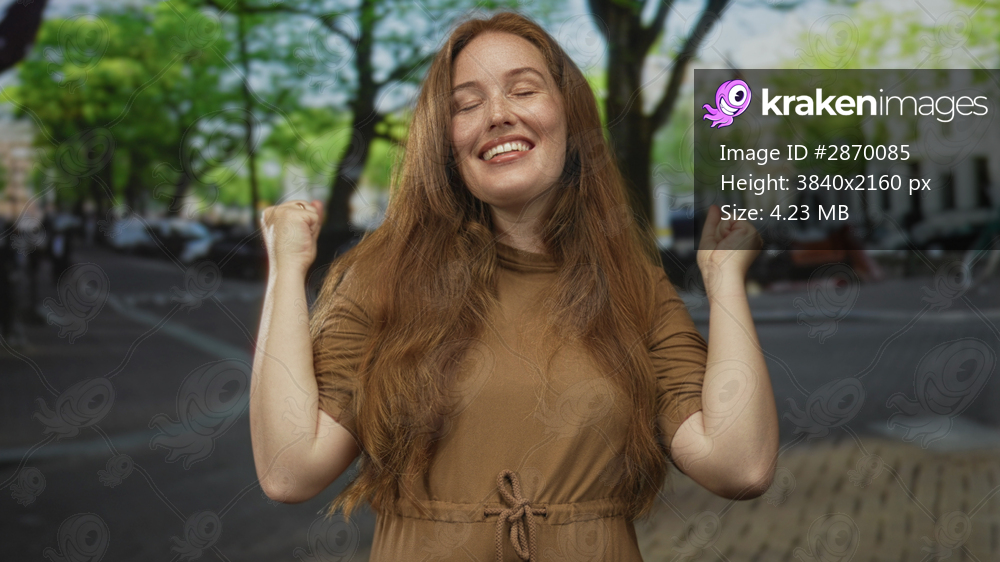 Young caucasian woman in brown dress covers mouth with hands on sunlit urban street; surprise reaction.
