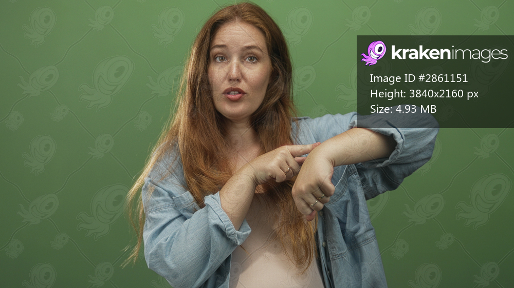 Young caucasian woman in denim shirt points finger to wrist under green studio lighting to signal she is late; urgency.